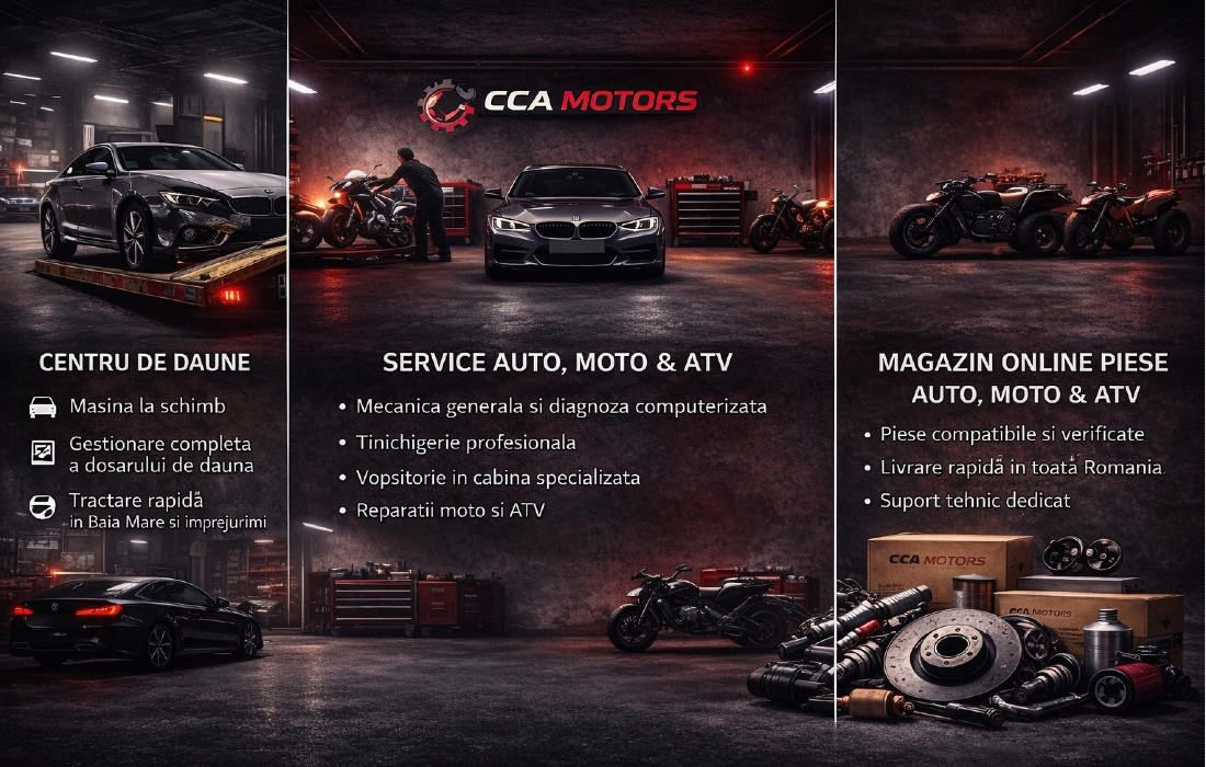 Din 2008, CCA Motors este un reper de profesionalism în domeniul service auto, moto și ATV în Baia Mare. Oferim soluții complete: reparații mecanice, tinichigerie și vopsitorie, centru de daune cu asistență integrală și magazin online cu piese auto, moto și ATV livrate rapid în toată țara.
